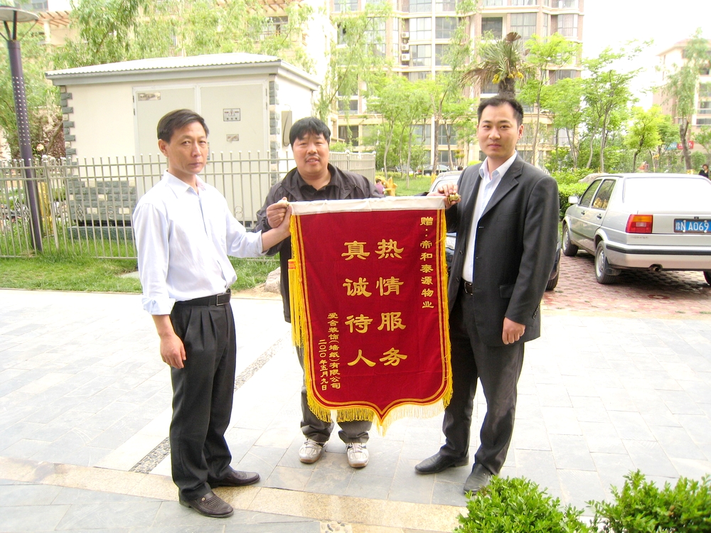 深圳泰源物業(yè)河南分公司在帝和·水上公園管理處的服務(wù)管理中,堅持貫徹落實科學(xué)發(fā)展觀,努力做到以人為本。在日常工作中,我們熱情為小區(qū)業(yè)主服務(wù),不但經(jīng)常受到業(yè)主表揚(yáng),同時一些裝修公司及合作伙伴也對我們的工作做出肯定。昨天,某裝飾公司把一面寫著熱情服務(wù)·真誠待人的錦旗送到管理處,表示在其為業(yè)主裝修時對我司的工作給予支持和肯定。