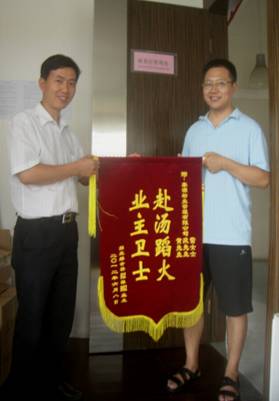 為感謝管理處及時發(fā)現(xiàn)火情和滅火, 劉女士特制作“赴湯蹈火,業(yè)主衛(wèi)士”錦旗到管理處致謝。