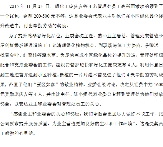 鳴翠谷業(yè)委會(huì)給管理處員工發(fā)紅包