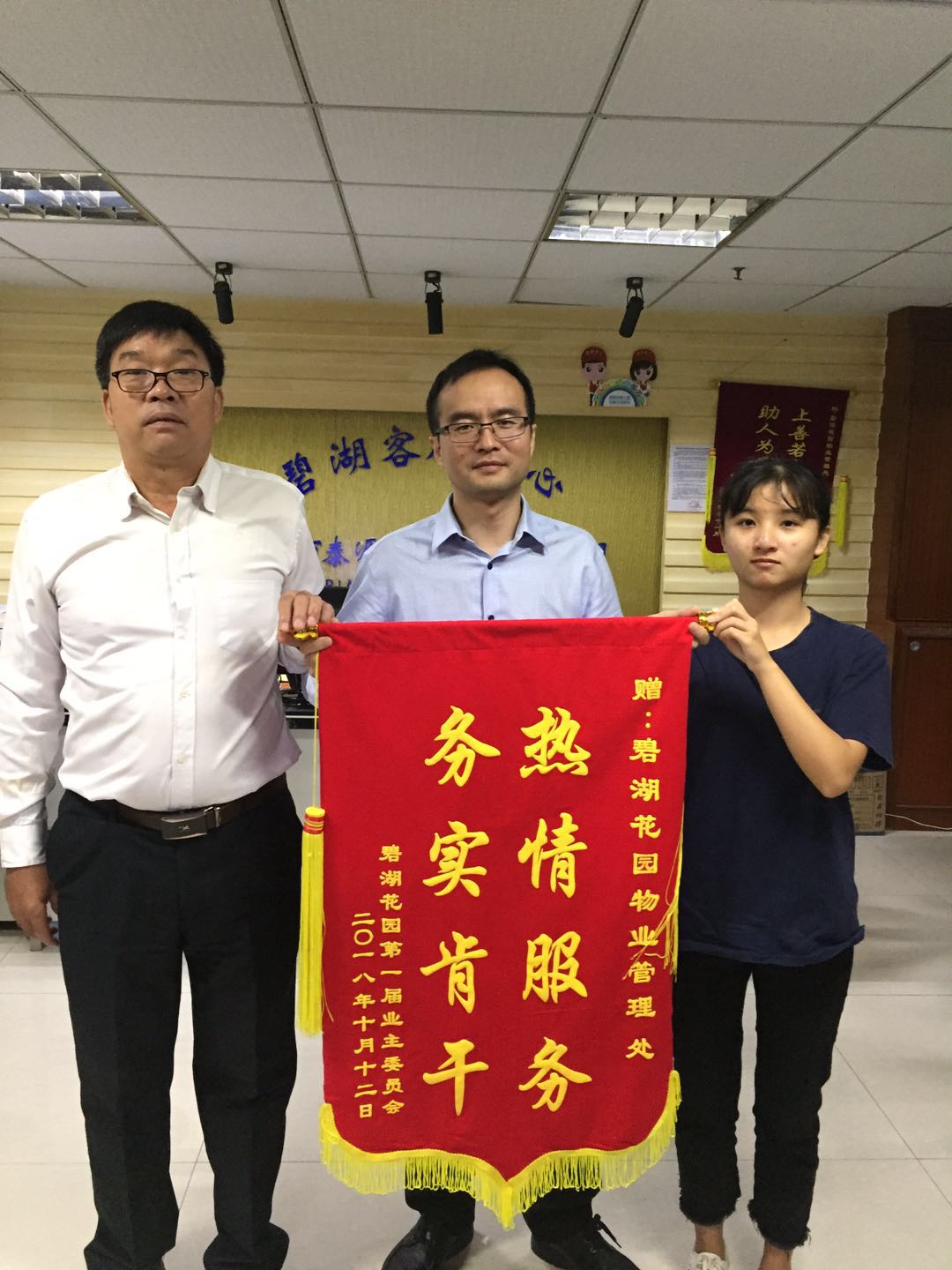 10月18日上午,“熱情服務,務實肯干”的錦旗由業(yè)主委員會主任送到了碧湖花園管理處,這不僅僅代表業(yè)主委員會的評價,也代表了全體業(yè)主對碧湖花園管理處物業(yè)服務工作的肯定、信任和支持。