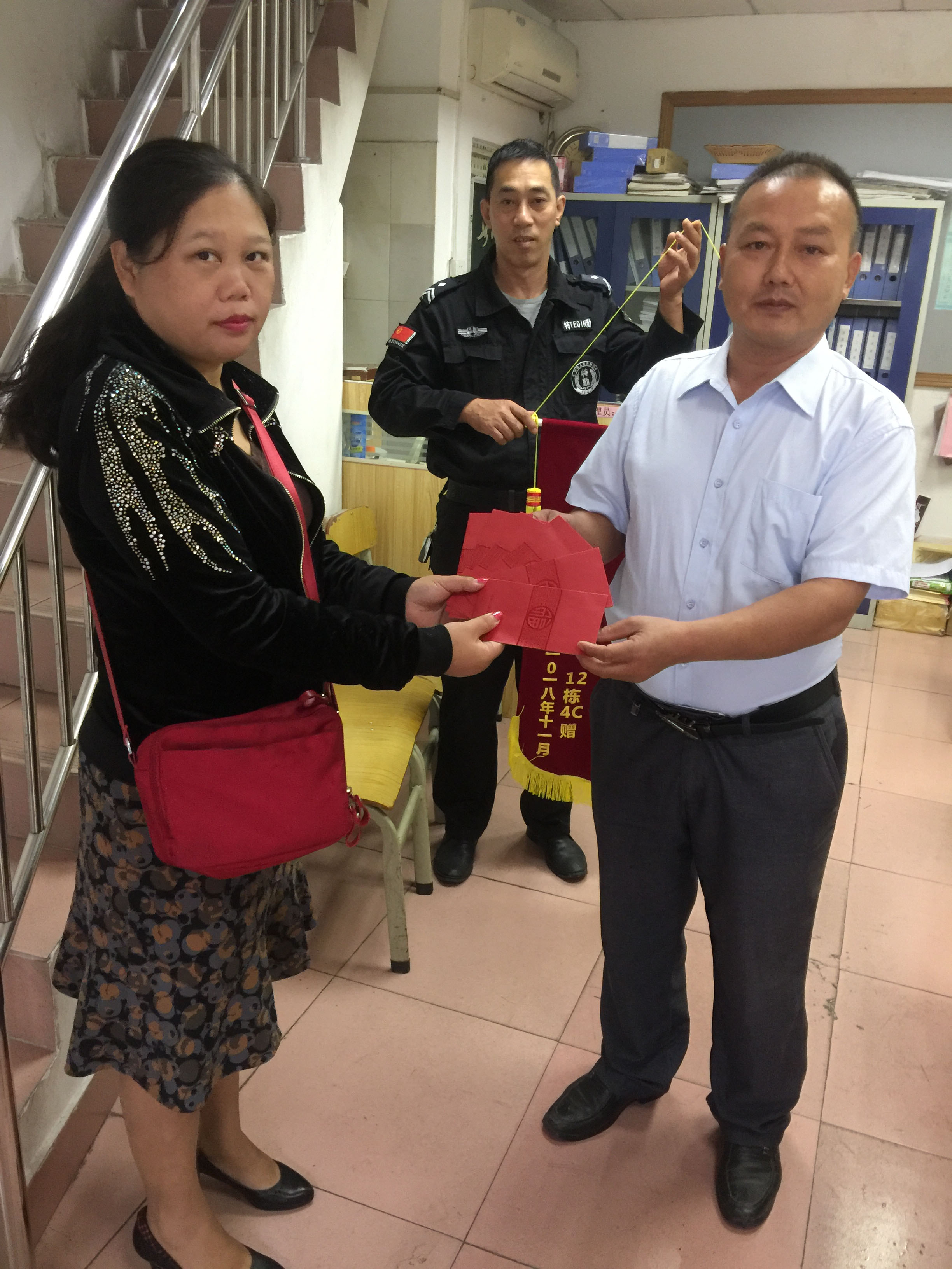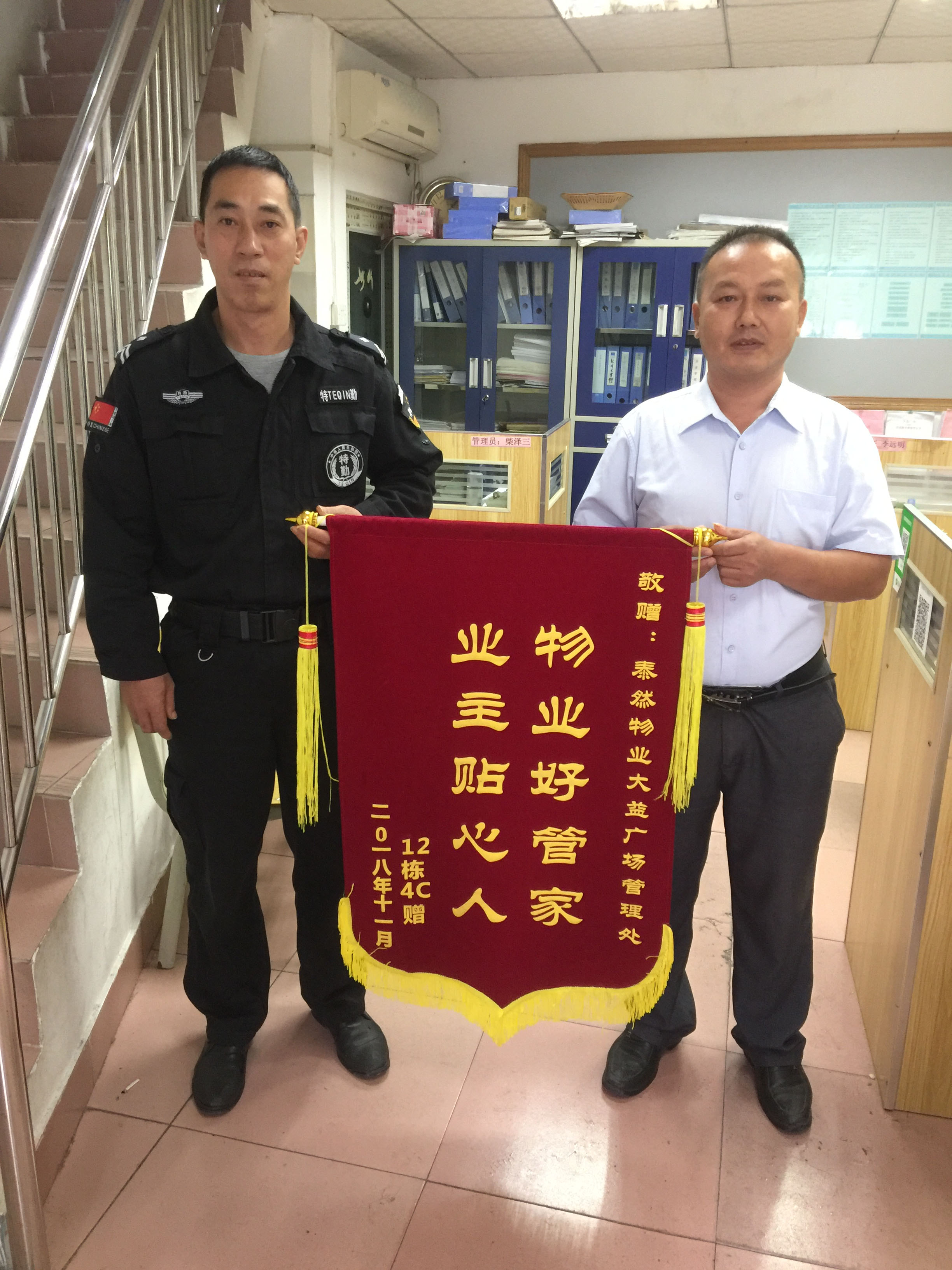 當(dāng)12棟4C業(yè)主收到10000元的協(xié)商賠款時(shí),感激萬(wàn)分。特制作錦旗兩面,分別贈(zèng)送給大益管理處和業(yè)主委員會(huì)。業(yè)主委員會(huì)也為參加抓小偷的柴澤三、王開金、杜賢立、林睦清、汪斌、徐林南分別頒發(fā)了獎(jiǎng)金,給予鼓勵(lì)。