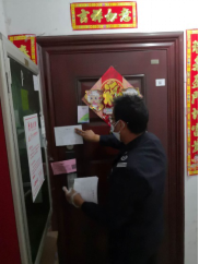汪斌為業(yè)主進出小區(qū)測體溫          張貼溫馨提示        為居家隔離業(yè)主送快遞