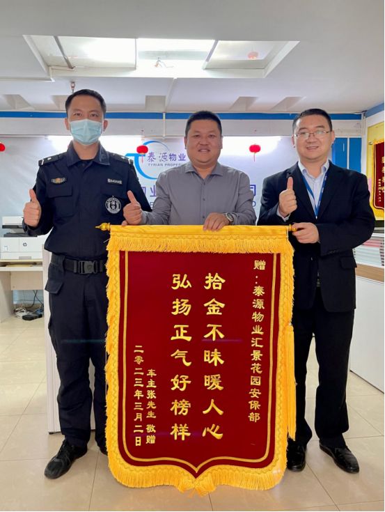 日,匯景花園小區(qū)的張先生拿著錦旗送到物業(yè)服務(wù)中心,對(duì)安保部人員忠實(shí)履職和“拾金不昧 ”的舉動(dòng)達(dá)衷心的謝意。